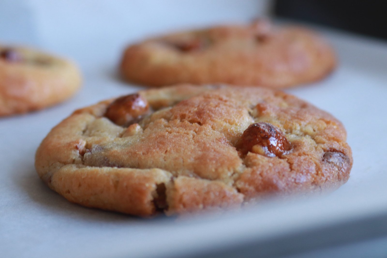 : Wheat flour, unsalted butter, caster sugar, brown sugar, eggs, milk chocolate, dark chocolate, Bourbon vanilla extract, baking powder, baking soda, salt.