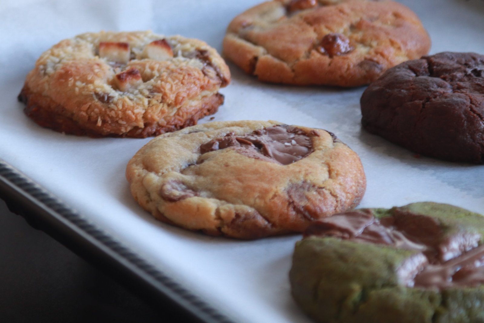 : Wheat flour, unsalted butter, caster sugar, brown sugar, eggs, milk chocolate, Japanese matcha powder, baking powder, baking soda, salt.